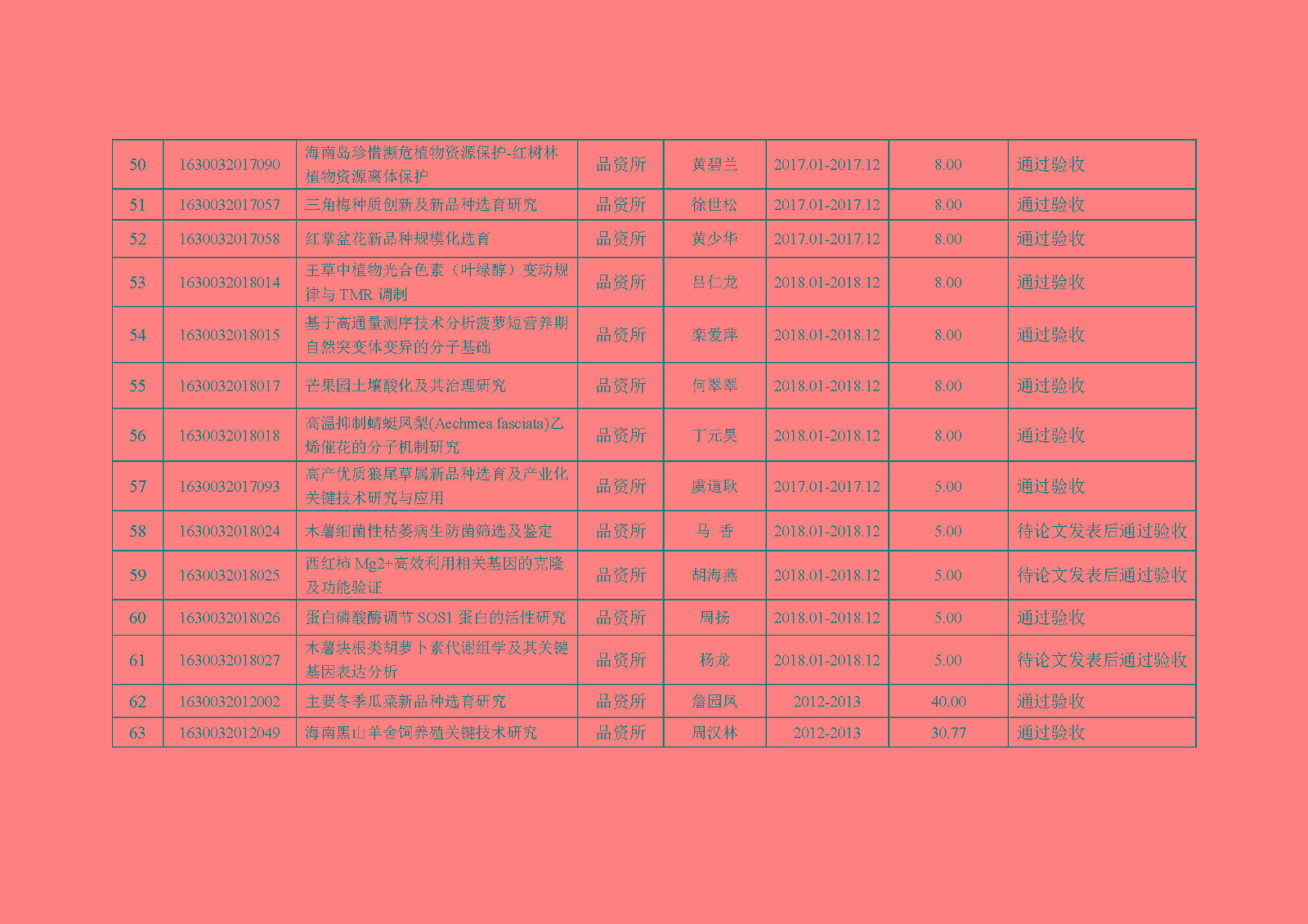 我所于2019年1月28-29日组织验收专家对2018年度到期基本科研业务费专项项目进行了会议验收。根据《中国热带农业科学院热带作物品种资源研究所基本科研业务费专项实施细则(试行)》(品资所〔2017〕47号)的要求,现将验收结果予以公示,公示期为5个工作日(2019年2月18日至2019年2月23日)。