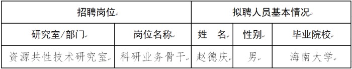 公示期间,如对拟聘用人员有异议,请向热带作物品种资源研究所人事处反映。所反映问题要真实客观,反映人需要用真实姓名并提供联系方式。